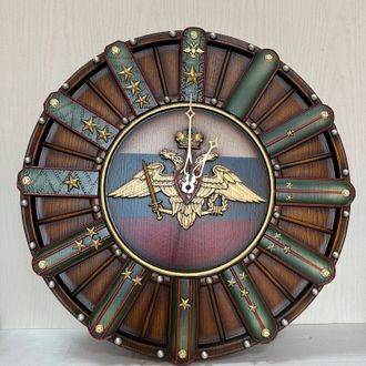 Часы из дуба, сделанные нашими мастерами, отвечают всем необходимым требованиям. Оригинальные настенные часы классической формы, посвященные воинской тематике, изготовлены в строгой цветовой гамме – от почти черного до золотого цвета. В центре циферблата на фоне цветов российского флага вырезан герб России. Циферблат, сделанный в виде погон, указывают на основные ступени военной карьеры – от рядового до генерала.