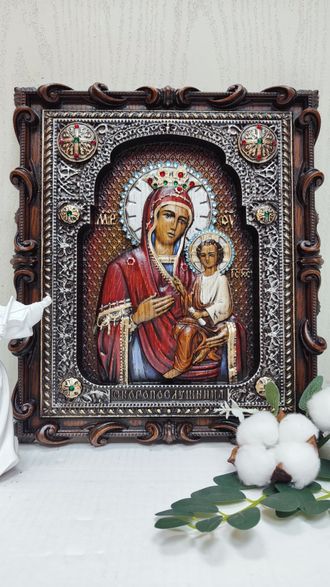 Материал: дуб, сусальное золото, поталь, камни Swarovski, краски