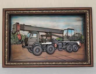 На панно представлен величественный Кран УЗС-85 – гигант строительной площадки. Чувствуется колоссальная сила, скрытая в каждой детали этого крана, способного перемещать огромные грузы и возводить новые высоты. Панно передает мощь и величие инженерной мысли.