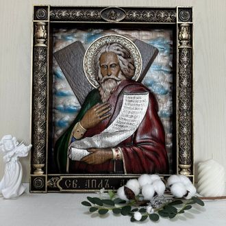 Икона Святой Апостол Андрей - резная деревянная, из натурального дуба. Изготавливается в нескольких размерах. Покрыта натуральными, высококачественными материалами, которые обеспечивают долговечность изделия. Икона написана по православным канонам, освящена.