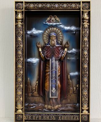Князь Даниил родился в 1261 году. Он был четвертым сыном святого великого князя Александра Невского. В жизни св. благоверный князь Даниил отличался благочестием, кротостью и миролюбием. Был царем преславного града Московского. Князь завоевал Переяславское княжество, однако, не услаждался властолюбием, а ограждаясь верой Божией, преуспевал в строительстве храмов, дорог и мостов. Господствуя в Московских пределах, Даниил построил за Москвой-рекой Даниловский монастырь. В этом монастыре сам князь принял иноческое пострижение. Приняв схиму, князь на 42 году жизни мирно отошел в царствие иное 4 марта 1303 года. 30 августа 1652 года мощи его были названы нетленными.