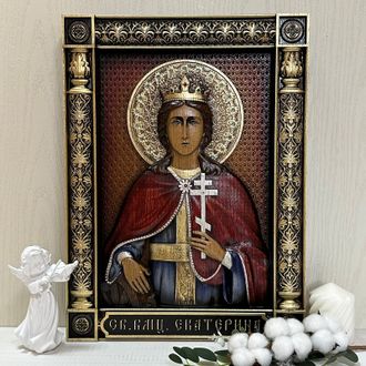 Икона "Святая великомученица Екатерина" - резная деревянная икона, из натурального дуба. Покрыта натуральными, высококачественными материалами, которые обеспечивают долговечность изделия. Икона написана по православным канонам, освящена.
