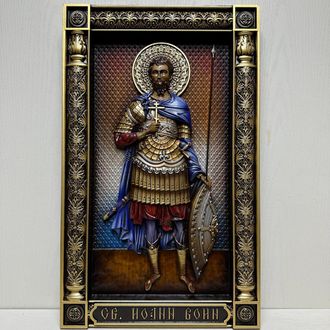 Икона Святой Иоанн Воин - резная деревянная, из натурального дуба. Изготавливается в нескольких размерах. Покрыта натуральными, высококачественными материалами, которые обеспечивают долговечность изделия. Икона написана по православным канонам, освящена.