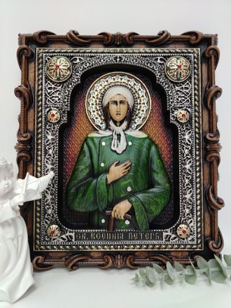 Резная икона с ликом святой блаженной Ксении Петербургской принесет в ваш дом мир, любовь и благополучие. Пожалуй, нет в России уголка, где бы не было известно имя святой скорой помощницы, божьей заступницы Ксении. Не иссякает людской поток к ее скромной часовне на Смоленском кладбище в Петербурге. Всех утешает она в скорби и печали.