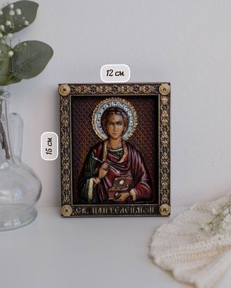 Икона посвящена христианскому святому, великомученику Пантелеймону Целителю, родившемуся в городе Никомедии. Пантелеймон уверовал в Христа после того, как стал свидетелем чуда воскрешения ребенка посредством молитвы. Пантелеймон получил образование врача и прославился своей целительской деятельностью.