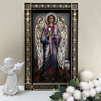 Икона Архангел Рафаил - резная деревянная, из натурального дуба. Изготавливается в нескольких размерах. Покрыта натуральными, высококачественными материалами, которые обеспечивают долговечность изделия. Икона написана по православным канонам, освящена.