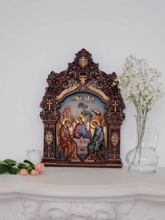Икона Святой Троицы — один из самых почитаемых и значимых образов в православной иконографии. Она представляет собой догматическое изображение Триединого Бога — Отца, Сына и Святого Духа — в виде трёх ангелов, сидящих за трапезой.