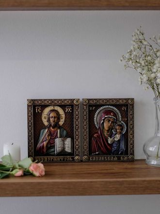 Для совершения таинства обычно берут икону Господь Вседержитель и к Нему чаще всего Казанскую или Владимирскую икону Божией Матери. Лучше, если перед венчанием молодых, их родители позаботятся и подарят им эти иконы. Но их могут приобрести и сами молодые или их друзья или родственники. Иконы должны стать семейной реликвией, которая будет передаваться из поколения в поколение.