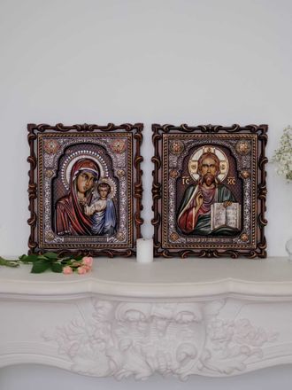 Классическая венчальная пара представляет собой две иконы, которые используются в обряде венчания в храме. При этом на одной из икон изображён светлый лик Пресвятой Богородицы, а на другом – лик Иисуса Спасителя. Эти иконы представляют собой единение двух божественных образов, которые будут стоять на защите семейных ценностей.