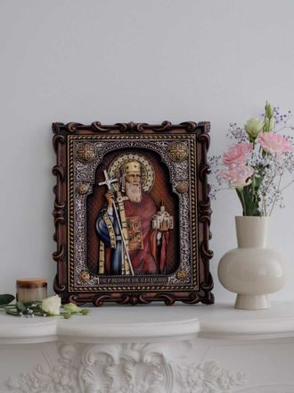 На резной иконе видим мы мудрого властителя земли русской, преодолевшего соблазны язычества и крестившего великую Русь в истинную веру. Пред образом святого Владимира молятся о духовном прозрении, об избавлении от распрей, мире в Отчизне, о спасении от различных бед и напастей, а также об исцелении от тяжких и глазных болезней.