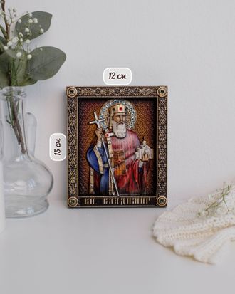 На резной иконе видим мы мудрого властителя земли русской, преодолевшего соблазны язычества и крестившего великую Русь в истинную веру. Пред образом святого Владимира молятся о духовном прозрении, об избавлении от распрей, мире в Отчизне, о спасении от различных бед и напастей, а также об исцелении от тяжких и глазных болезней.